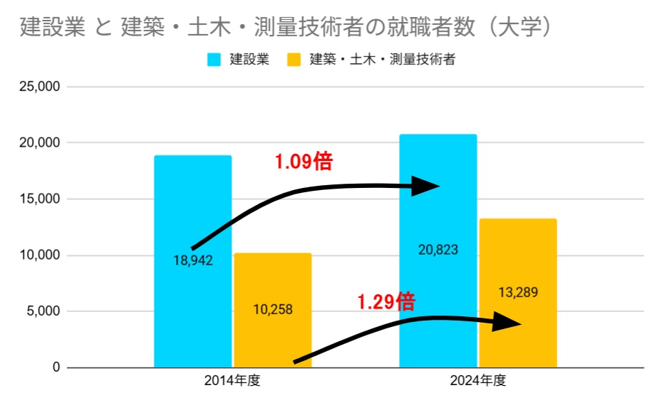 まず、新卒の就業動向を見てみましょう。2024年度の大学新卒者のうち、建設業界への就職者数は20,823人。「建築・土木・測量技術者」は、13,289人にのぼります。10年前と比較すると、技術者は約1.3倍に増加しており、新卒者の関心が高まっていることがわかります。